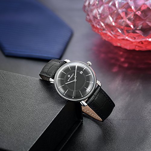 -. Feature : クオーツ (日本製ムーブメント)、表示:アナログモデル、カレンダー:日付、バックル:穴留めタイプ、5気圧防水機能付き。 / ケース直径(約):38mm、ケース厚み:12mm、ベルト幅さ:18mm、重量:42g。 / 裏蓋:ステンレス、 ケース:ステンレス、ベルト:本革(ブラック)、風防:ミネラルガラス 文字盤:ブラック。防水:50m(日常生活に適用、水圧の変化が激しい条件下ではご使用おやめください。)。 / 初期不良などのトラブルの場合、30日間返品や交換を承ります。電池寿命は2年間で、当店の商品は安心の2年間保証期限をご提供致します。 / 傷防止材質、透明感が高くて文字盤が見やすい高硬度の無反射ミネラルガラスを採用し.洗練されたデザインの腕時計。フェイスは適度の弧度のもポイントです。べルトは本革レザーを採用して、デザインにも材質にも高級感演出します。シンプルでカジュアルなファションスタイルは現在最も流行っているデザインです。フォマールな腕時計なので、どんな服と場合でもぴったりします。