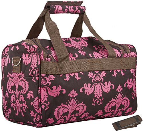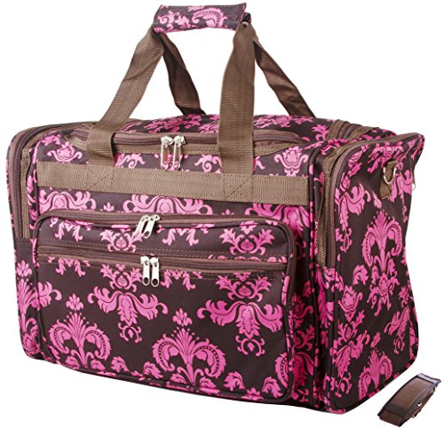 -. Brand : World Traveler -. ClothingSize : 22-inch -. Color : Damask - Brown Pink -. Department : womens -. EAN : 0763598183707 -. Feature : Adjustable, detachable non-slip padded shoulder strap / U-top opening provides easy access to roomy zipper secured main compartment / Metal feet allows stabiity to bag when setting down and provides bag floor not to touch floor directly to get dirty / Front exterior zip pocket with two exterior end zip pockets / Silver pewter hardware -. Model : T22-632 -. MPN : T22-632 -. NumberOfItems : 1 -. PackageQuantity : 1 -. PartNumber : T22-632 -. ProductGroup : Apparel -. ProductTypeName : LAGE -. Size : 22-inch -. Title : World Traveler Brown Pink Floral Damask Duffle Bag 22-inch -. UPC : 763598183707