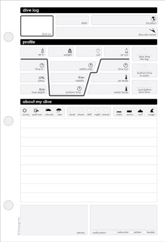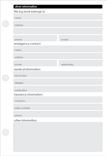 Diver info, equipment checklists, notes. Record Nitrox and cumulative dive times.