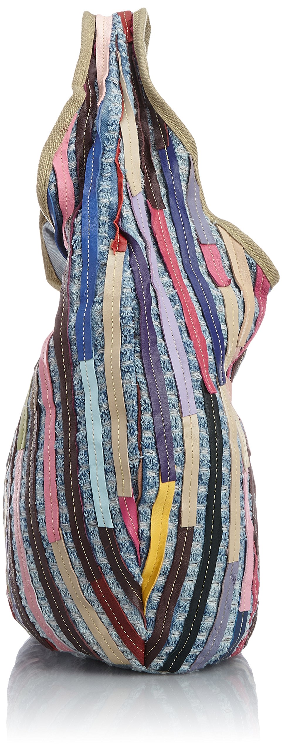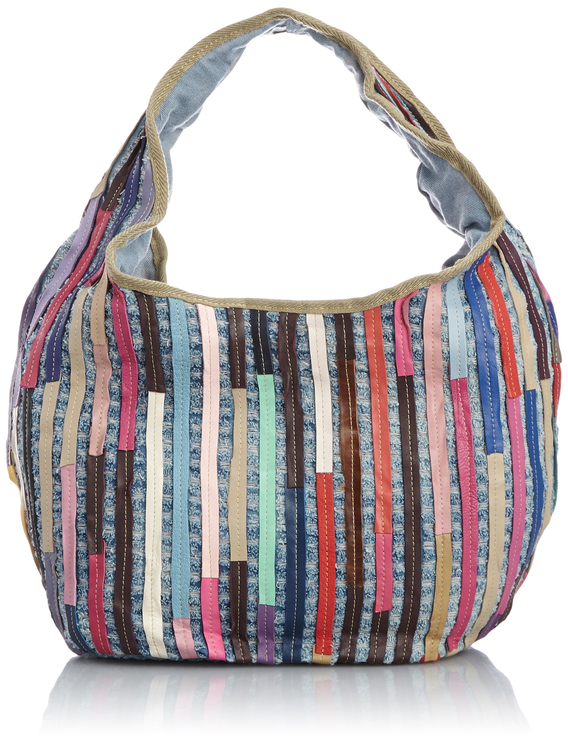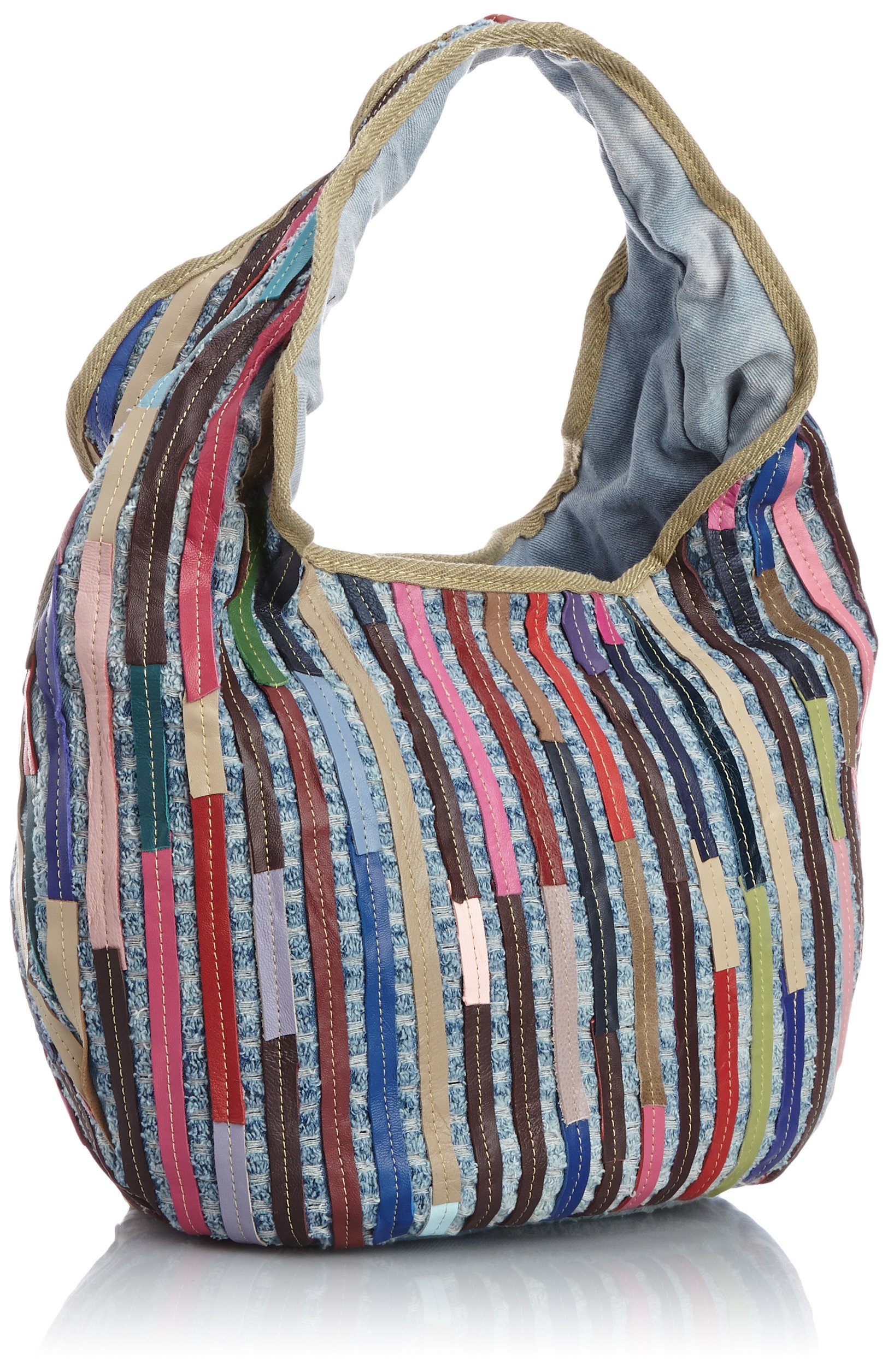 Patchwork tote bag with lively look with treated striped leather in denim fabric.