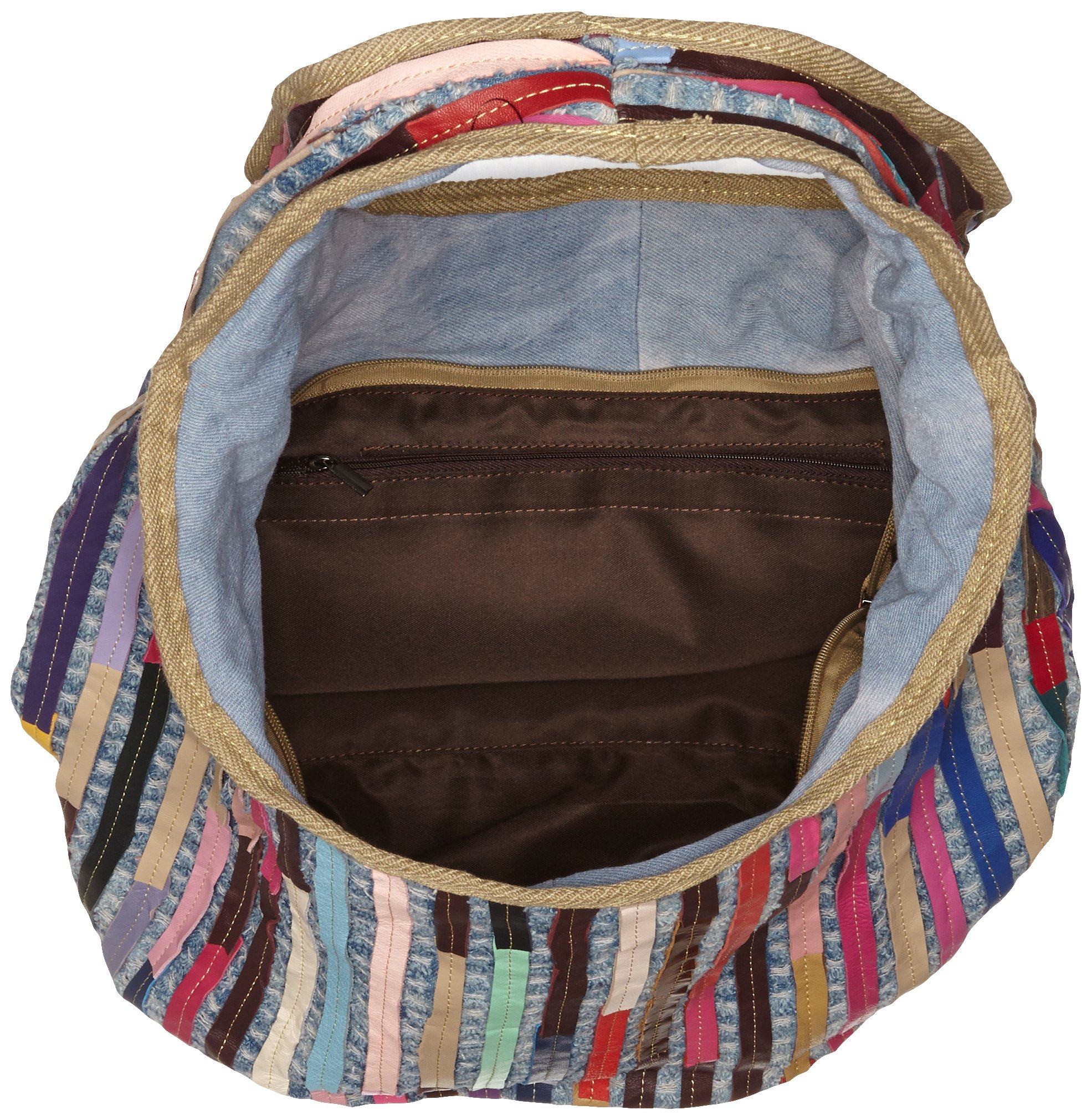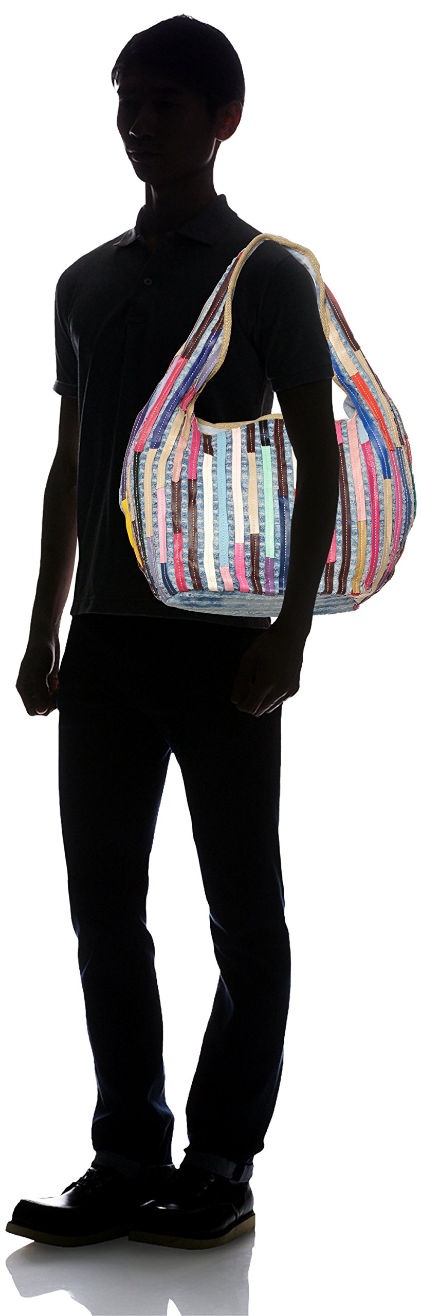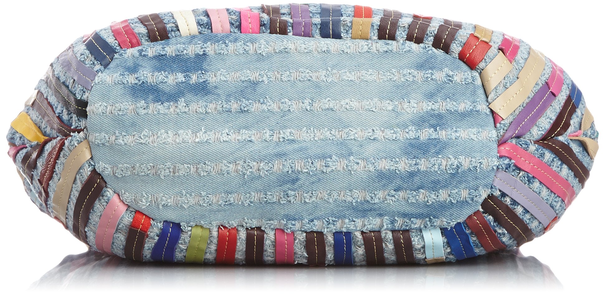 Patchwork tote bag with lively look with treated striped leather in denim fabric.