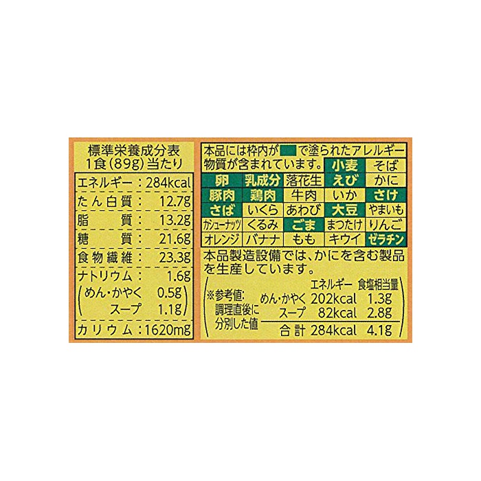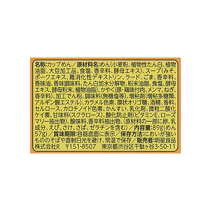 원재료:면(소맥분,식물성 단백,식물성 기름지,식염,난분,향기 맛 조미료,다시마 엑기스,향신료)고, 스프(된장,포크 엑기스,라드,식염,참깨,향신료,향기 맛유,향기 맛 조미료,단백 가수분해물,분말 유지,효모 엑기스,식물성 기름지)고, 인지(든가) 질투하다(돈닭 맛을 내는 솜씨육,멘《마》,파,향신료)고, 가공 나오지 않겠 분,조미료(아미노산등)고, 증점제(증점다당류,알긴산 에스테르)고, 카라멜 색소,환상 올리고당,물어 들이마시고, 향료,셀룰로오스,카로 치노 이 드 색소,유화 제,미립2산화 규소,감미료(《스쿠라로스》)고, 산화 방지제(비타민E,rosemary 추출물)고, 《차》추출물,신맛료,향신료 추출물,(원재료의 일부에 유성분,새우,하 #고, 하면,젤라틴을 포함한다)