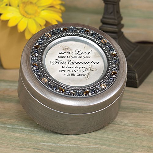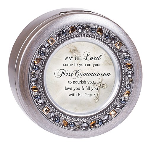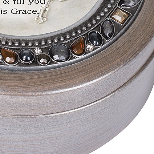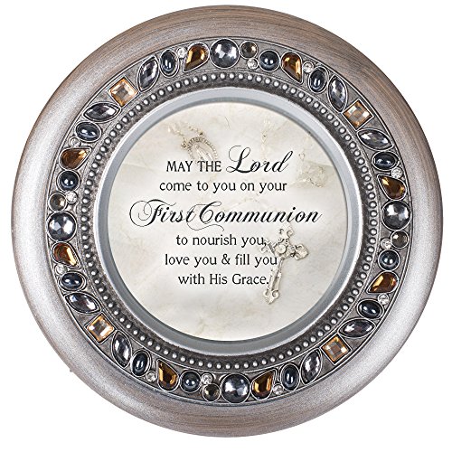 First Communion With Grace Cross Brushed Silver Round Jeweled Music Box Plays Tune Amazing Grace