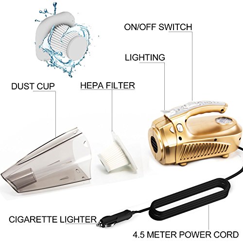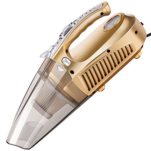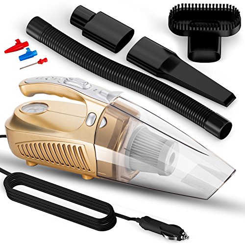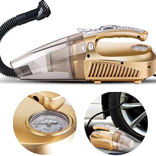 -. Feature : 12-Volt 100W super suction handheld car vacuum cleaner, it easy to keep your car neat and provides you and your family a healthy and clean environment. / 4 IN 1 MULTI-Functions with vacuum cleaning, LED lighting, air inflating and tire pressure measuring. / Even in a narrow car space, it works great to clean both solid or liquid things, such as crumbs, sand, pet hair and other small things. / The filter can be taken out and washed, you can use a toothbrush to gently wash detergent plus, it is reusable but you need dry it fully after washing. / Package contents: 1x Cheyoll Car Vacuum Cleaner; 1x Flat Crevice Nozzle; 1x Lengthen Flexible Hose; 1x Inflator Hose; 1x Dust Brush; 3x Valve Accessories.