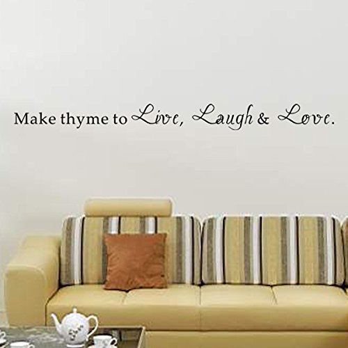 ReleaseDate : 2015-10-24 Studio : Pop Decors Publisher : Pop Decors Binding : Baby Product Product Description High quality wall art product by Pop Decors, creates hand painted look on your wall. Free squeegee. SIZE: 59"W Color: Black The text says: Make theyme to Live, Laugh love. Decals can be applied on smooth and clean surface (walls, glass, doors etc. . ). Not recommended for textured walls (orange, sandy and grainy), fresh paint (less than 14 days) or low VOC (Volatile organic compound) paint. Original designs by Pop decors. 2010 Copyrights Protected. . 0