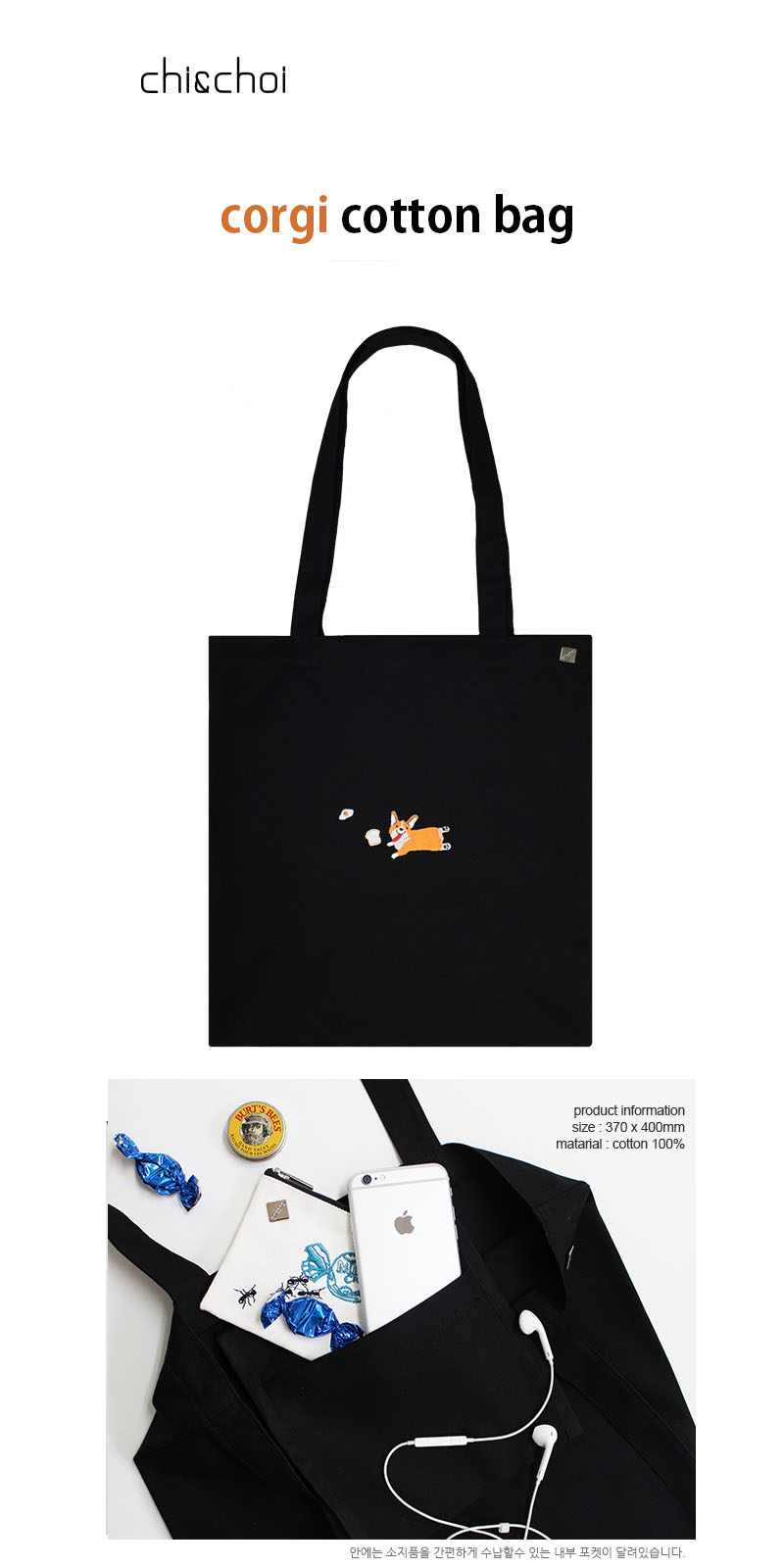 - 주문시 유의사항 : [중요] 검정색 가방입니다! 검정색 원단은 코팅된 재질이 아닌 이상 먼지가 심하게 두드러져 보입니다. 특히나 소지품을 넣어 쓰는 가방의 용도이기때문에 먼지가 많이 붙습니다. 먼지나 오염에 민감하신 분들은 구매 전 확인해주세요!! 식빵이 연상되는 앙증맞은 웰시코기의 뒷태가 돋보이는 에코백입니다. 물빠짐없는 편안한 코튼소재의 검정원단에 견고하게 놓인 자수가 유니크한 포인트가 되어줄거에요. 내부에 안주머니가 있어 수납하기 편리하고 어디든 가볍게 시즌에 관계없이 들고 다니기 좋으실거에요. :)