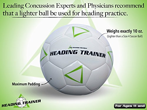 -. Binding : Misc. -. Brand : The Training Triangle -. EAN : 0728461202169 -. Feature : For Ages 11 and Up - Ultra lightweight Size 5 Soccer Ball that only weighs as much as a Volleyball (10 oz) / Train perfect heading technique without the sub concussive impact from a regulation size ball / Our ball is about half the weight of a typical size 5 soccer ball and designed to be purposely under inflated while maintaining its bounce and responsiveness - resulting in impact that is less than 50% of a regular ball / A Ball for a Ball: For every heading trainer ball sold, we donate a high quality soccer ball to disadvantaged youth in the USA / Download the Triangle Training Method App for technique training and games to use with the Heading Trainer - http://www.theheadingtrainer.com/video-guide.html -. IsAutographed : 0 -. IsMemorabilia : 0 -. Label : The Training Triangle -. Manufacturer : The Training Triangle -. MPN : 5804208 -. PackageQuantity : 1 -. PartNumber : 5804208 -. ProductGroup : Sports -. ProductTypeName : SPORTING_GOODS -. Publisher : The Training Triangle -. Size : size 5 -. Studio : The Training Triangle -. Title : Heading Trainer Soccer Ball -. UPC : 728461202169