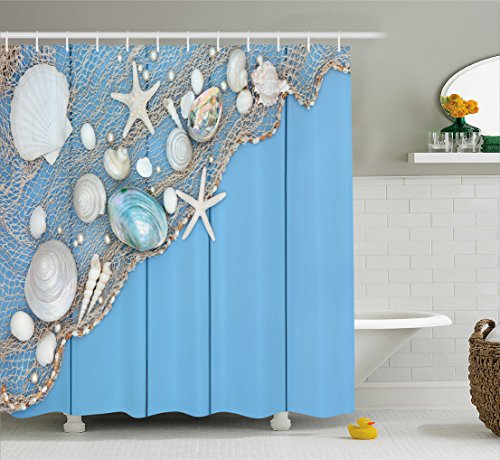 Tropical Shower Curtain by Ambesonne, Seashells on a Fishing Net Wooden Blue Background Pearls Scallop Starfish Aquatic, Fabric Bathroom Decor Set with Hooks, 84 Inches Extra Long, Blue White