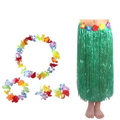 - ASSORTED COMBINATIONS- Package includes 1 green hula skirt with hibiscus flowers waistbands, 1 floral necklace, 1 floral headband, 2 wrist flowers. You can wear the complete set or wear the single one to create your own fashion style.