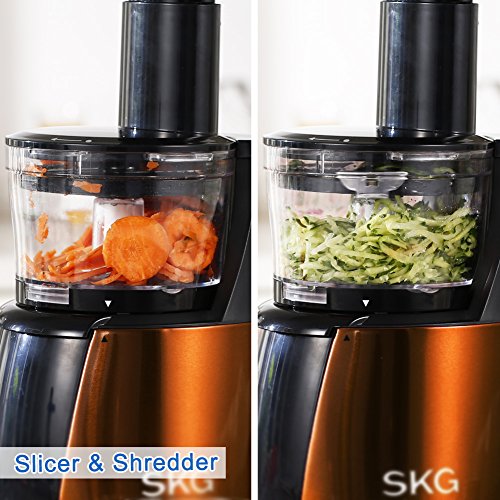 2-IN-1: BUY ONE (Juicer), GET ONE FREE (Food Processor). - The gear-driven, cool-running, high-torque masticating motor works perfectly as the heart of a food processor (Slicer & Shredder) for slicing potatoes, carrots, cucumbers, sausages, etc. at 0.08-inch thin slices, or for shredding food at 0.12-inch small shreds. Accessories are included: stainless steel slicer & shredder blades, food guide tube, adjustable food pusher (2 diameters: 2.6 inches and 1.7 inches), and two screwing axes.