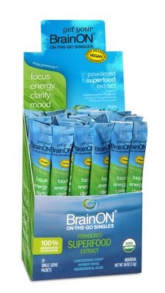 Featuring BrainON On-The-Go Singles by E3Live! A box contains 30 individually wrapped single-serve 1 gram stick packs of BrainON powder - easy to take with you and add to your favorite juice, smoothie, or even just water. Concentrated E3AFA extract of Phyocyanin and PEA. BrainON is a super concentrated organic E3AFA (Aphanizomenon flos-aquae) extract of Phycocyanin and Phenylethylamine (PEA). BrainON contains the active ingredient in wild-harvested AFA that may help promote mood balance and enhanced focus. PEA (also found in chocolate) is a naturally occurring extract that may promote clear thinking and focus to give you optimal cognitive function. Phycocyanin is a powerful antioxidant and natural anti-inflammatory. certified organic gluten free vegan no additives or preservatives. Try it today!Feature