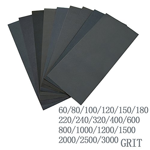 Including 3 sheets of each grit:60/80/100/120/ 150/ 180/ 220/240/ 320/ 400/ 600/ 800/ 1000/ 1200/ 1500/ 2000/ 2500/ 3000 totaling 54 sheets