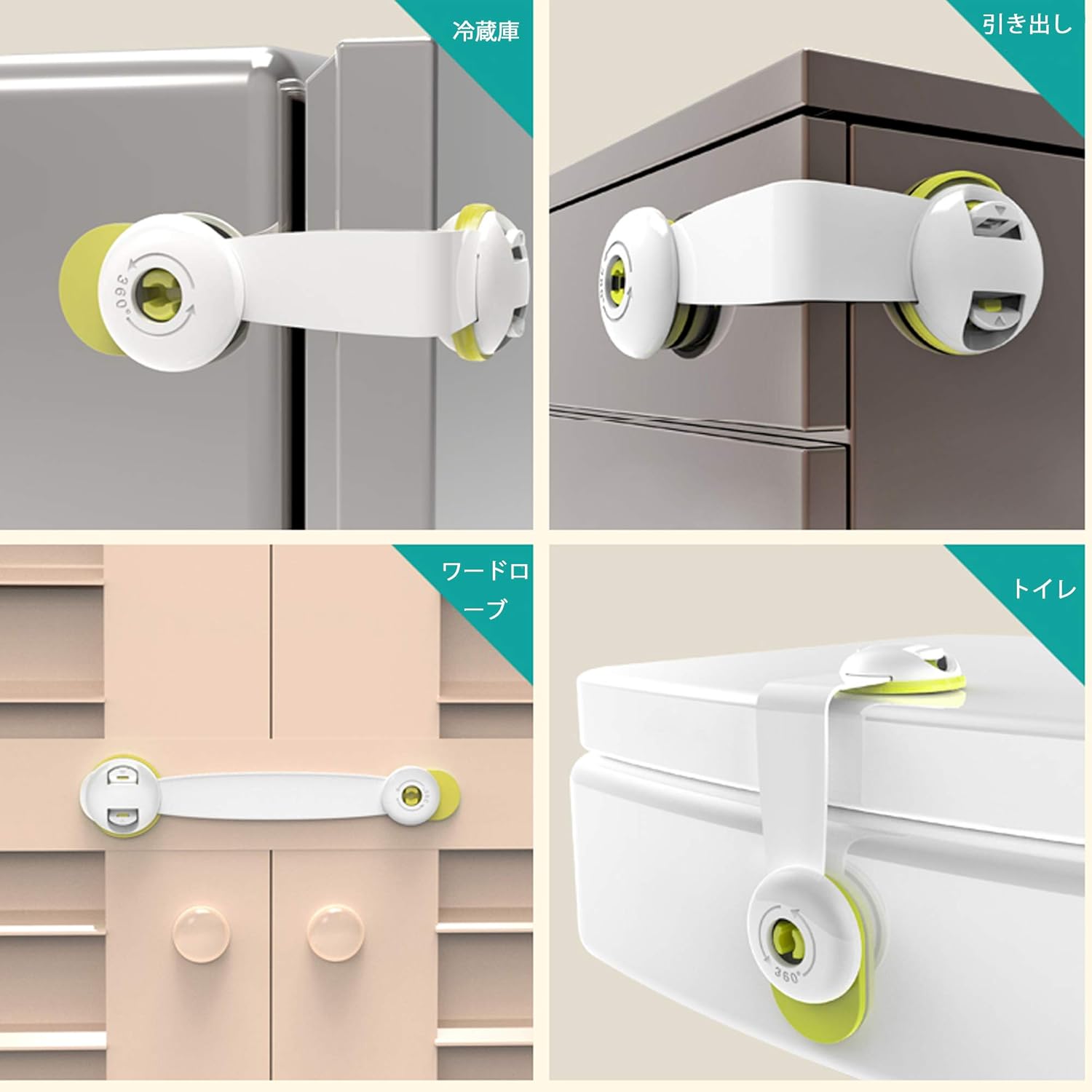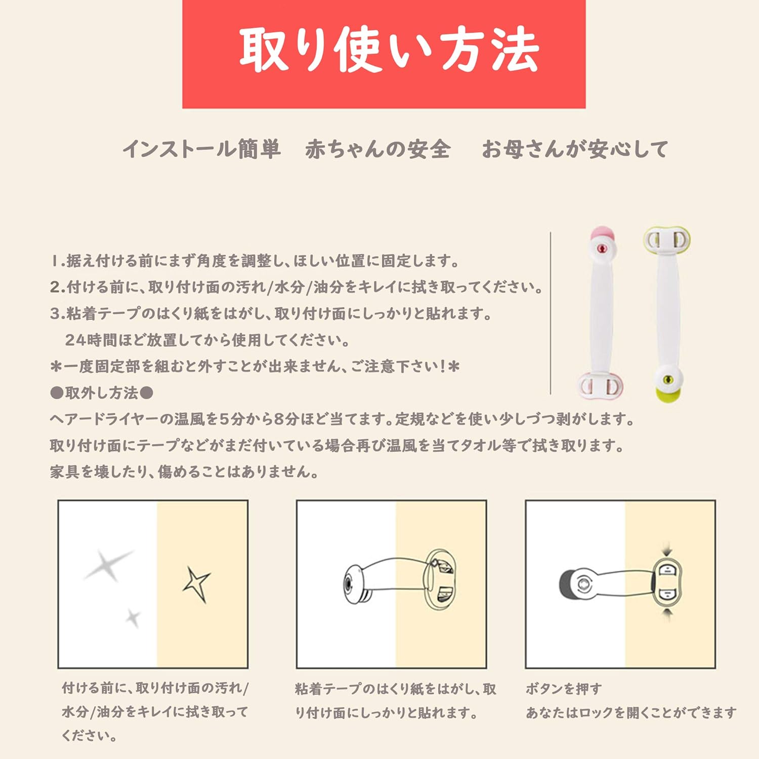 🚼 戸棚、引き出し、ドア、トイレ、ゴミ箱、冷蔵庫、窓等どんな平らな表面にも貼り付けられます。穴あけや道具などは必要ありません。テープなので家電や家具を傷つけることもありません。