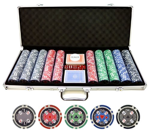 Poker Chip Set includes an aluminum carrying case, 2 decks of playing cards, 5 red dice, and a dealer button