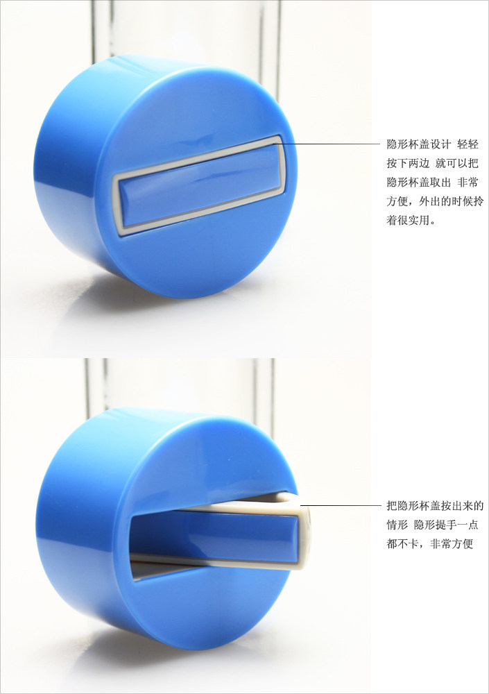 隐形杯盖设计,非常实用,外出的时候轻轻按下提手,就可将提手取出,拎着走,非常方便哦。