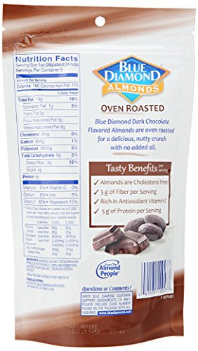 -. Binding : Grocery -. Brand : Blue Diamond Almonds -. EAN : 0041570110478 -. Feature : Our dark chocolate oven-roasted almonds are made with real cocoa and loaded with rich chocolate flavor, blended with just the right amount of sugar and naturally no-calorie stevia extract -. Label : Blue Diamond Growers -. Manufacturer : Blue Diamond Growers -. PackageQuantity : 1 -. ProductGroup : Pantry -. ProductTypeName : GROCERY -. Publisher : Blue Diamond Growers -. Studio : Blue Diamond Growers -. Title : Blue Diamond Almonds, Oven Roasted Dark Chocolate, 5 Ounce -. UPC : 041570110478