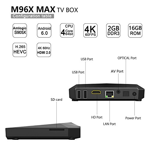 -. Feature : 2GB RAM & 16GB ROM-- A large space for storage and system running, let go the headache of picture freeze from less running space, you can watch movies, browse webpages or play android games as many as you like. / M96X Max is a mini size small form factor Android TV Box powered by the Amlogic S905x 4K Ultra-HD H.265 capable chip, four 64 bits ARM Cortex-A53 cores and penta-core ARM Mali-450 GPU / Rapid & Stable System-- With OS updated to the latest Android 6.0 version, coupled with the rapid and stable configuration, provides you the benefit of using all the latest updates and having access to all the tools, games and apps at the play store smoothly. / Media Center- Thousands of apps are compatible with the M96x Max Android TV Box.You can install your favorite apps.Experience all of this in a big screen! / 4k Ultra High Definition Streaming compability,giving you best-in-class television experience with true-to-life picture quality when used with compatible 4K Ultra HD TVs,Highly performance as same as android 7.1 TV Box.