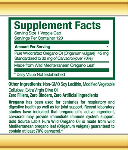 -. Title : 100% Pure, Wild Oregano Oil - 120 Liquid Veggie Capsules - Standardized Extract with 32 mg of Carvacrol (over 70%), by Gold Source Labs