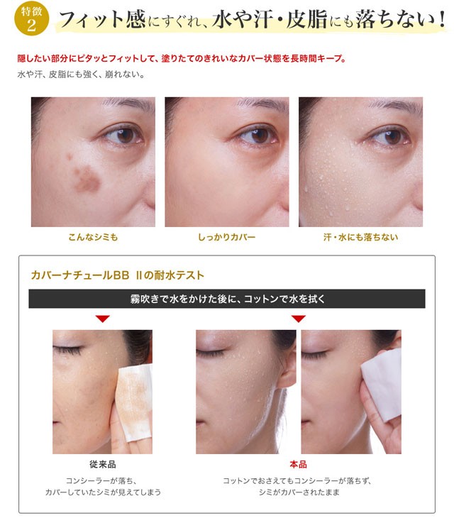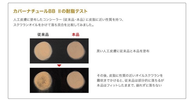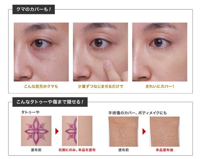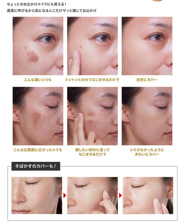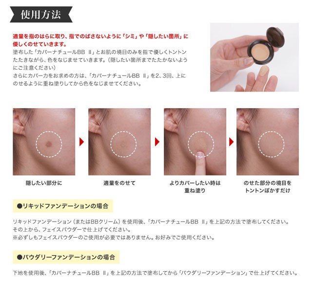 | ご使用方法 | ●部分的にお使いになる場合 本品を指のはらにとり、カバーしたい部分の上にやさしく適量のせてなじませます。 ●広範囲にお使いになる場合 本品をカバーしたい箇所に薄く広めに指でポンポンとたたきこみながら伸ばしてください。 |