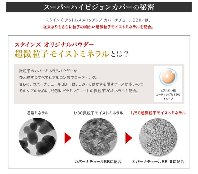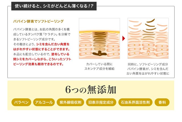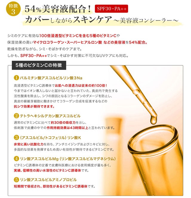 | 成分 | 酸化チタン、オクチルドデカノール、トリエチルヘキサノイン、カルナウバロウ、キャンデリラロウ、タルク、マイクロクリスタリンワックス、リン酸アスコルビルMg、リン酸アスコルビルアミノプロピル、パルミチン酸アスコルビルリン酸3Na、テトラヘキシルデカン酸アスコルビル、アセチルヒアルロン酸Na、加水分解ヒアルロン酸、ヒアルロン酸Na、加水分解コラーゲン、パルミチン酸エチルヘキシル、(アスコルビル/トコフェリル)リン酸K、スクワラン、パパイン、ミロタムヌスフラベリフォリア葉/茎エキス、トコフェロール、カプリル酸グリセリル、イチョウ葉エキス、オウゴン根エキス、リンゴ酸ジイソステアリル、ペンチレングリコール、酸化スズ、酸化ジルコニウム、AMP、オリザノール、ジメチルシリル化シリカ、シリカ、デキストリン、プロパンジオール、水、BG、水酸化Al、酸化亜鉛、含水シリカ、エチルヘキシルグリセリン、酸化鉄、ハイドロゲンジメチコン |