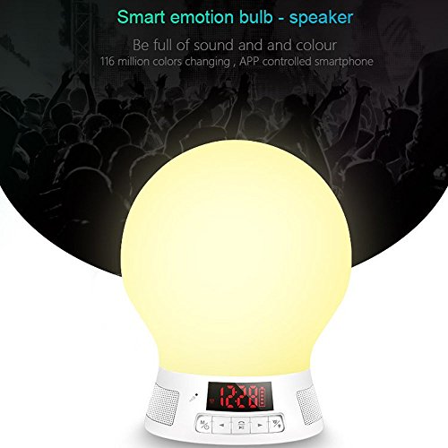 Smart Lamp Speaker & FM Radio & Outdoor Pendent Bulb - High quality bluetooth speaker with LED light, connect smartphone with bluetooth can make phone call handfree, freedem hands, enjoy chating and music. Open FM APP or turn on FM Mode, adjust frequency according to local FM channel, so you can listen to FM radio. This smart bulb with 1800MA li-battery and a hook ring can hang on tent or hook ect, bring in night at the same time can enjoy music