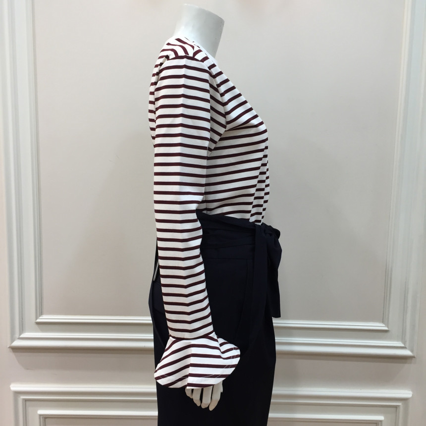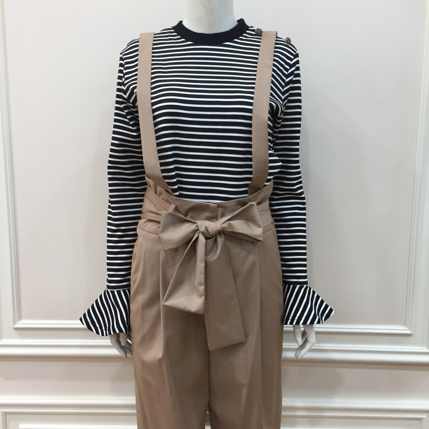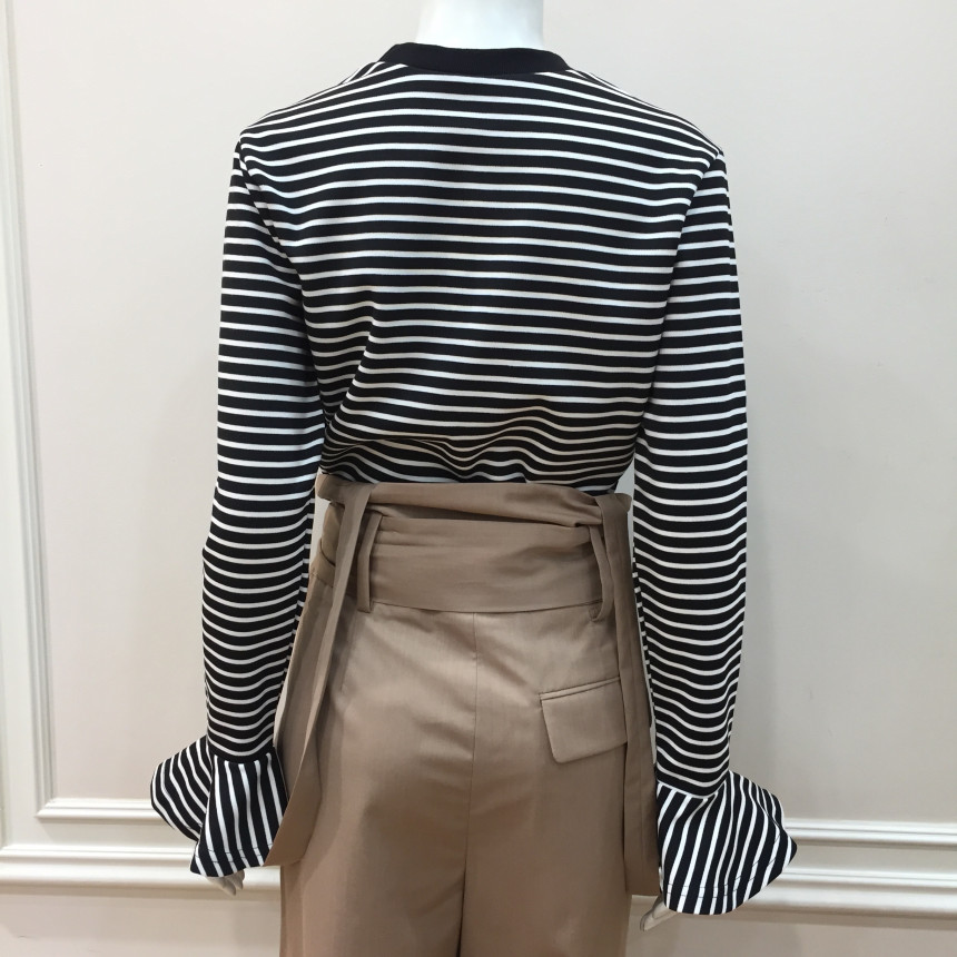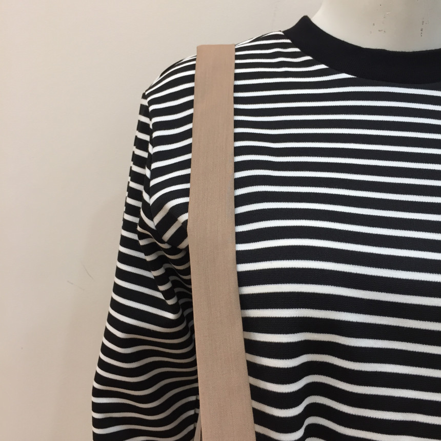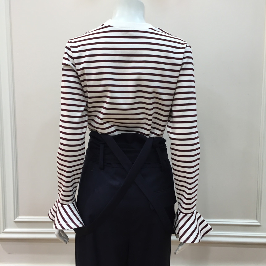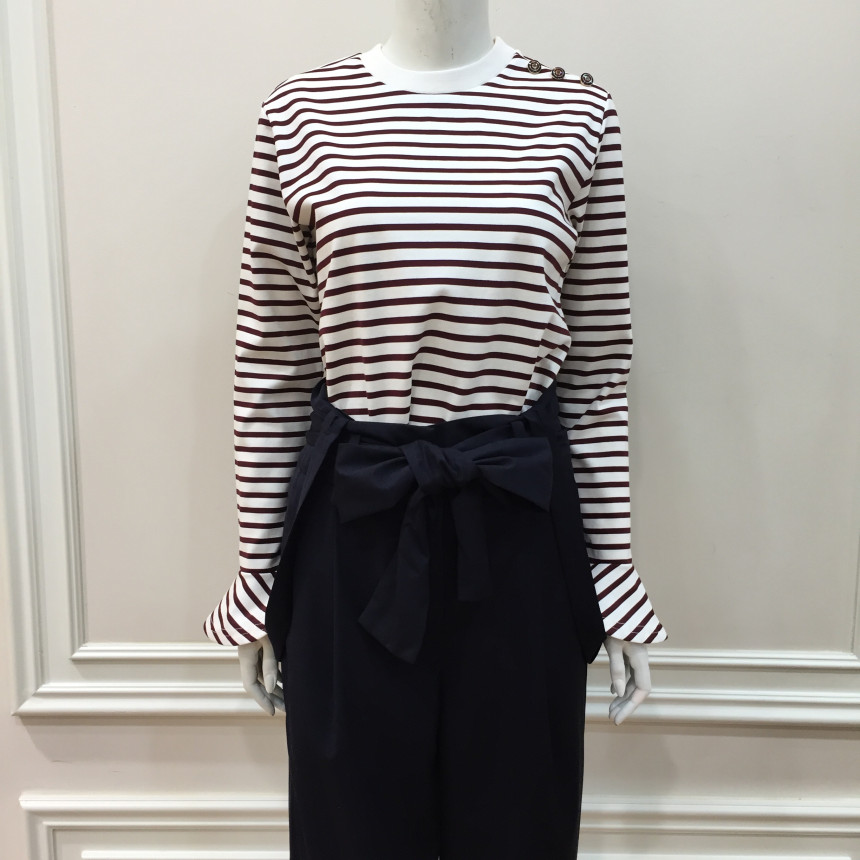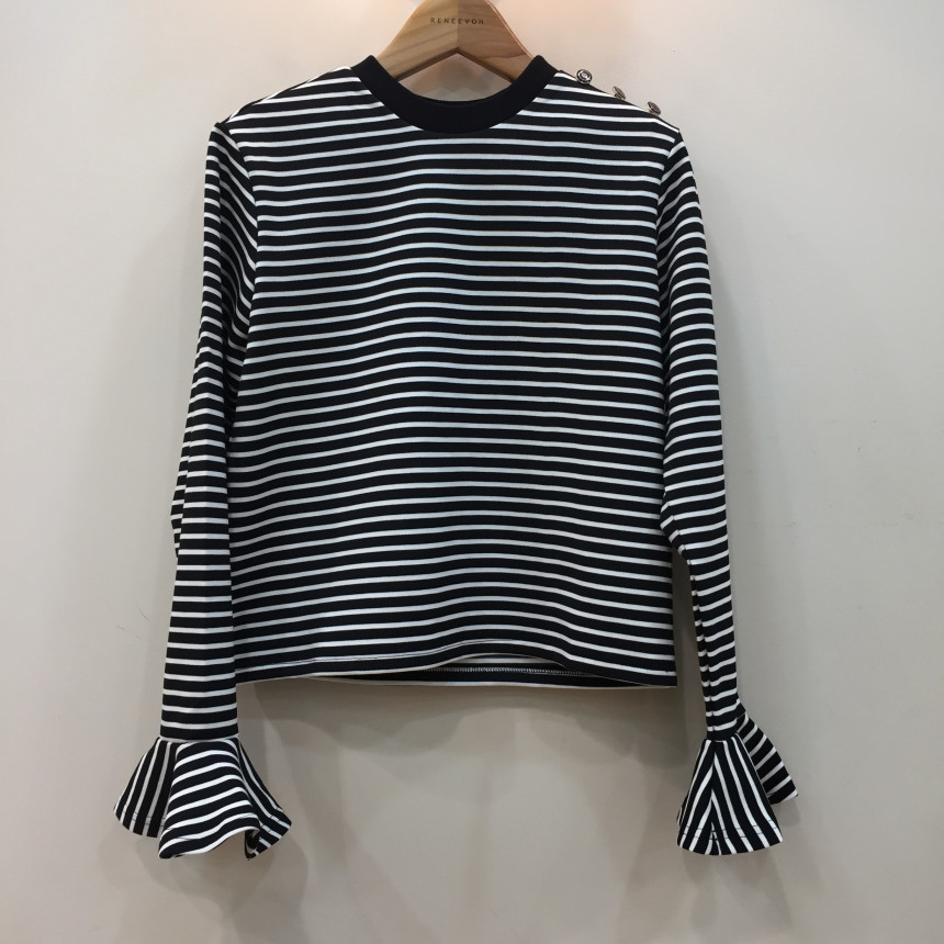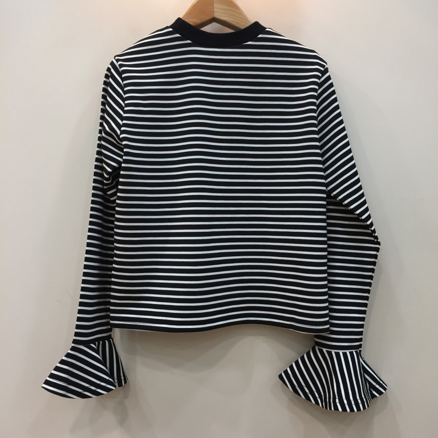 두께감이 있고 니트같은 텍스처를 가지고 있는 스트라이프 티셔츠 입니다.숏한 기장감에 소매라인에 러플이 있어 코트 속에 입으시면 귀엽게 연출 할 수 있습니다.어깨부분에 금속 장식이 있어 단품으로 입어도 포인트가 됩니다.