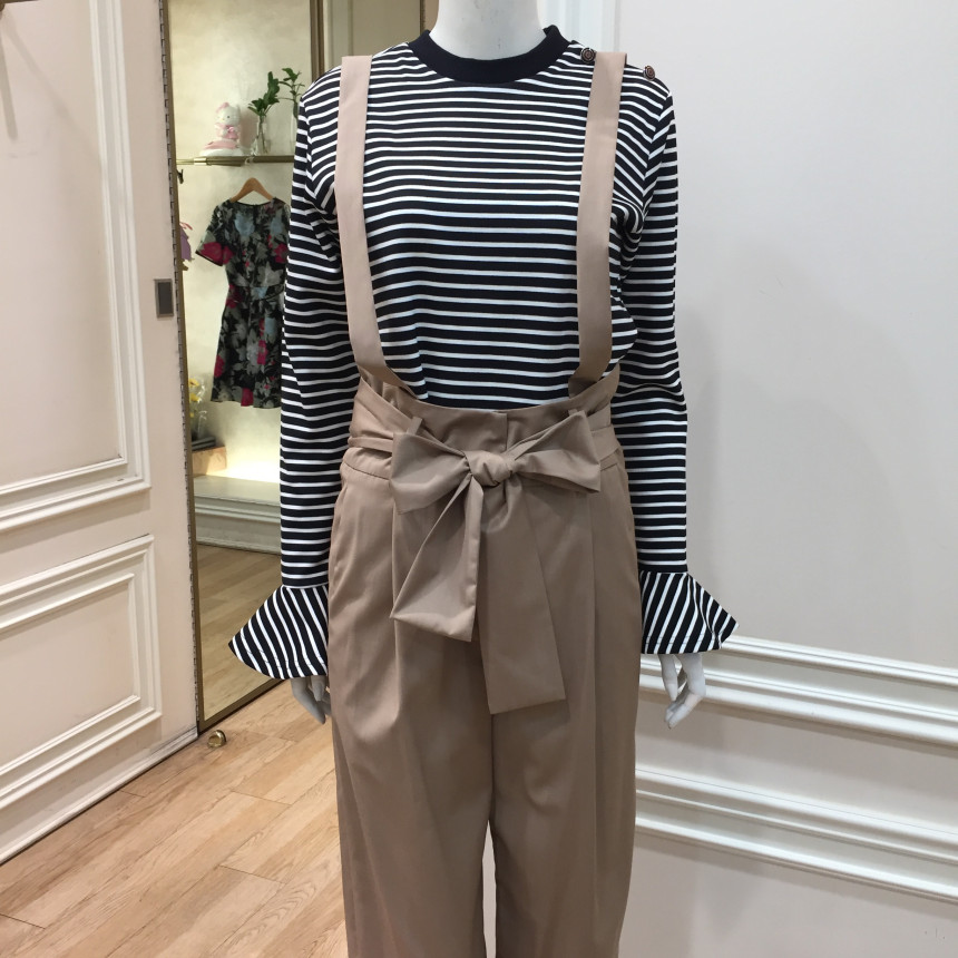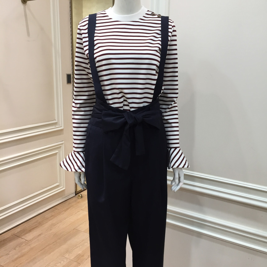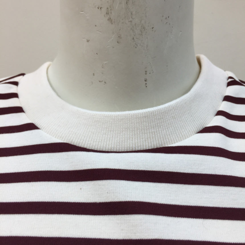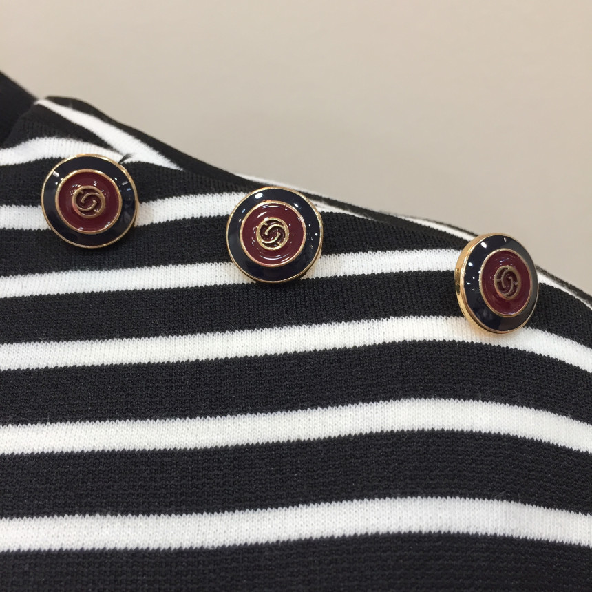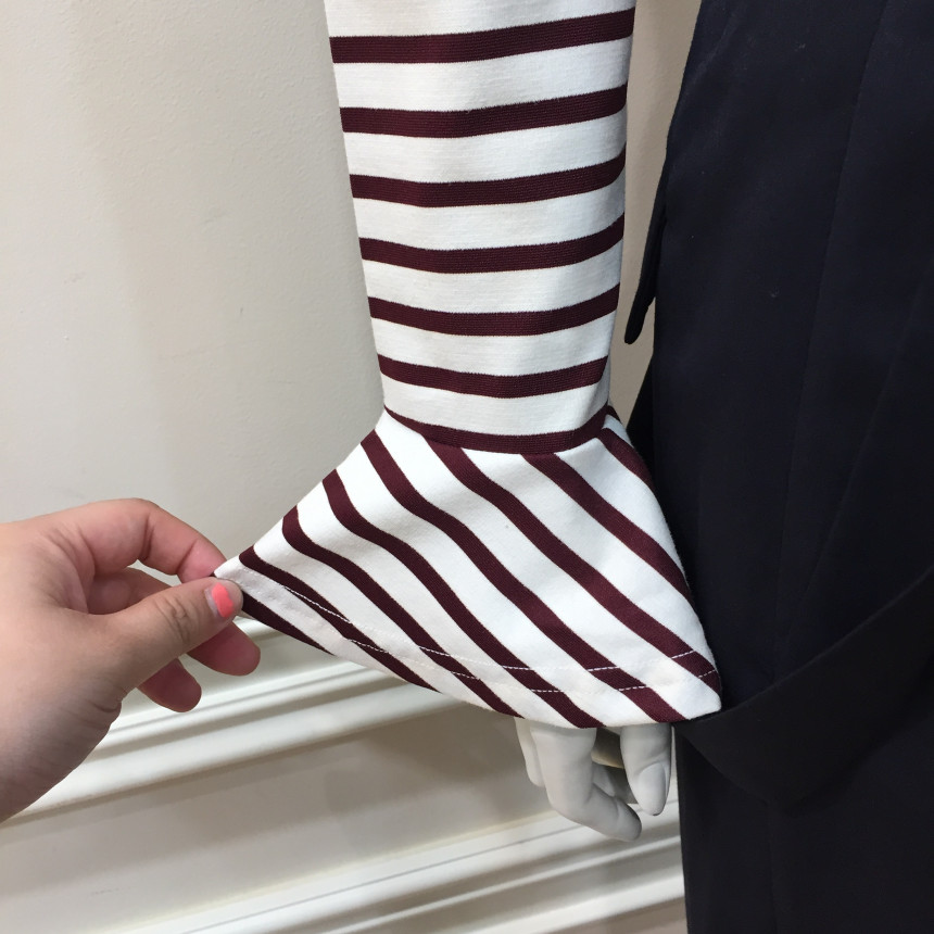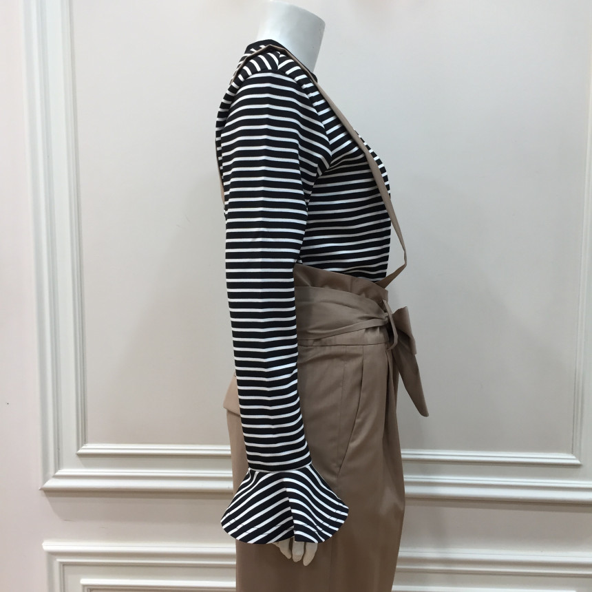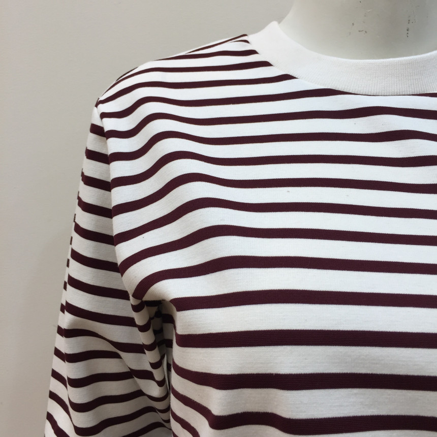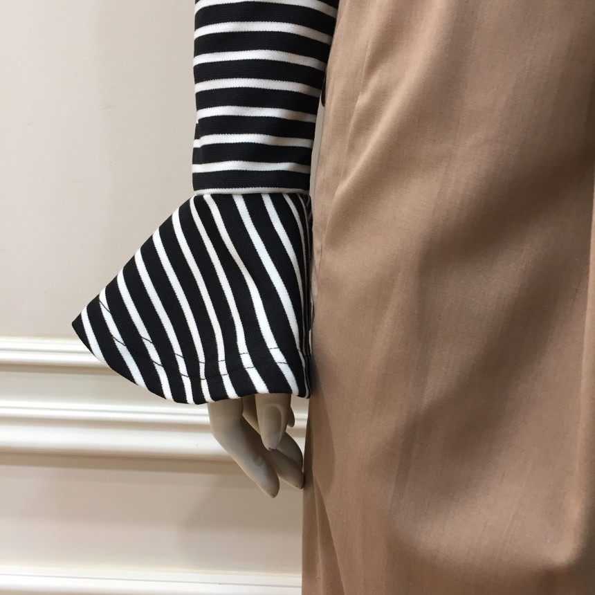 두께감이 있고 니트같은 텍스처를 가지고 있는 스트라이프 티셔츠 입니다.숏한 기장감에 소매라인에 러플이 있어 코트 속에 입으시면 귀엽게 연출 할 수 있습니다.어깨부분에 금속 장식이 있어 단품으로 입어도 포인트가 됩니다.