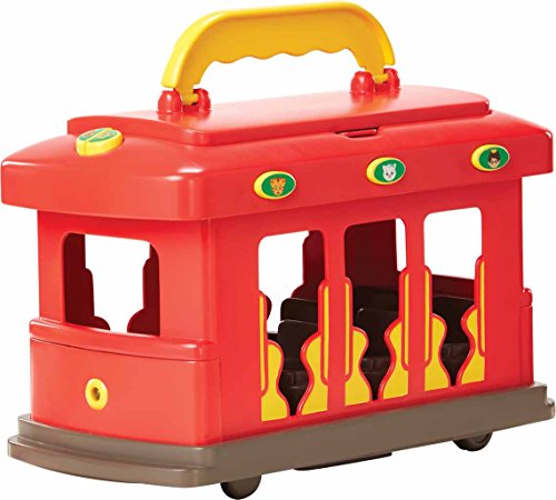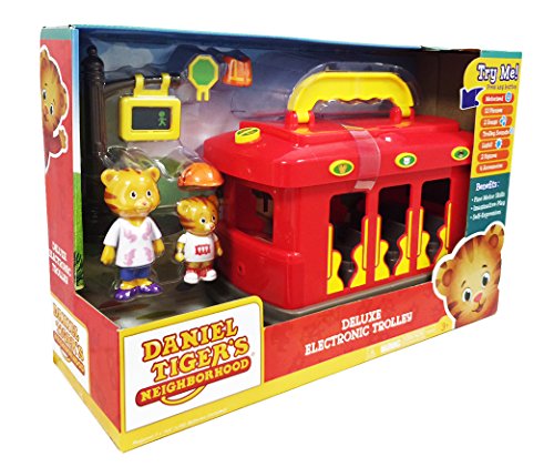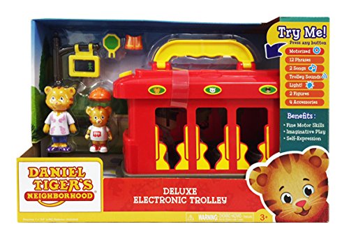 Daniel Tiger Deluxe Electronic Trolley - Join Daniel Tiger and his friends for a ride around the neighborhood on this deluxe working trolley! Load up Daniel Tiger, his mom, and his friends to go on a tiger-tastic adventure full of imagination! Trolley comes with 2 figures: Daniel Tiger and his mom. - At the push of a button, Trolley lights up and moves forward all by itself! Another button plays the Neighborhood Song and the Stop & Listen song. Trolley also has 6 character buttons with 2+ fun phrases each and includes Trolley sounds! - Open the trolley to place the characters inside; Trolley holds up to 6 figures. The trolley lid doubles as storage space for the play pieces, which include safety vest, hat, stop sign and street sign. - Your little Daniel Tiger fan will love to ride along with Trolley, Daniel Tiger, and friends!Feature