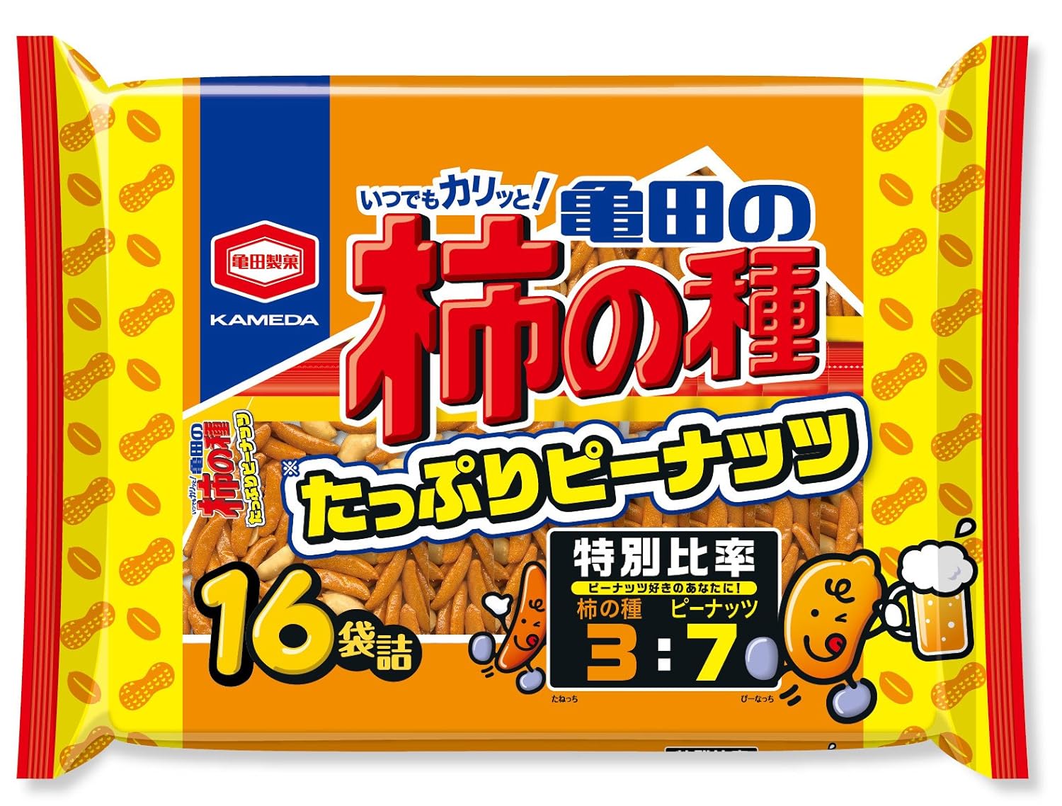 通常の柿の種は柿の種とピーナッツの比率が6:4に対し、この柿の種たっぷりピーナッツは柿の種とピーナッツがなんと3対7の特別比率! ! お酒を飲む方に、このこだわったバランスがたまらない商品です。そしてみんなで分け合える大袋サイズの16袋詰商品です。ちょっと小腹が空いたときやお酒のおつまみに、「亀田の柿の種たっぷりピーナッツ」をぜひお召し上がりください。1食分ずつ小分け包装することで、ピーナッツの酸化及び味の劣化を避け、味を保つことが可能となり家族全員で食べるものから個人消費、行楽時のおやつなどの用途が増えた商品です。