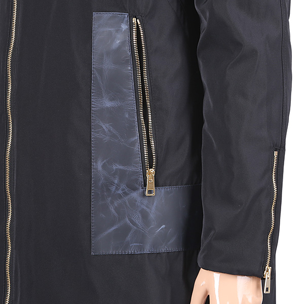 이 제품은 앞뒤 앞면으로 입을 수 있는 제품으로 앞면의 야상스타일의 제품으로 가죽배색과 바람막이 원단으로 젊고 세련되며 고급스러우며