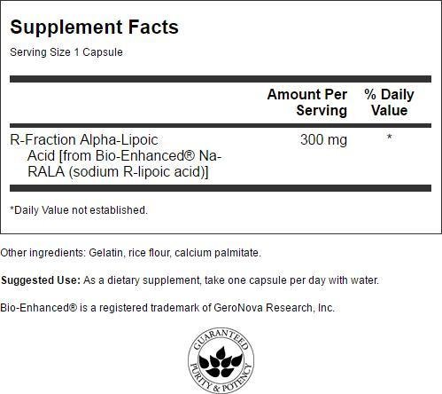 Swanson Ultra R-Fraction Alpha Lipoic Acid features R isomer alpha-lipoic acid, the only form that occurs naturally in the human body, and the one responsible for most of alpha-lipoic acid's beneficial effects. This product provides R-alpha-lipoic acid bound through a patented process, making it a highly stabilized form of R-alpha-lipoic acid capable of delivering the antioxidant nutrient into the bloodstream faster than other forms.Feature