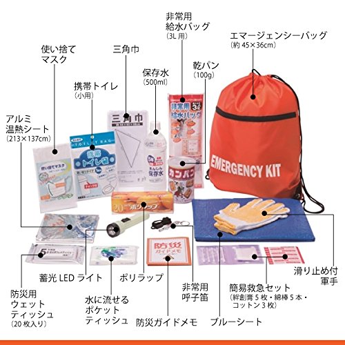 【세트 내용】emergency(응급) 백,축광LED라이트,비상용 급수 백(3L용)고, 알루미늄 온열 씨트,수에 흘려 보내는 포켓 티슈(10매)고, 미끄럼방지부 목장갑,휴대 화장실(볼일)고, 방재용 Wet 티슈(20매)고, 비상용 요부코적,삼각건,블루 씨트,보존 수(500ml)고, 건빵(100g)고, 폴리 랩,일회용 마스크,간이 구급 세트(반창고5 매면봉5개 코튼3매)고, 방재 가이드 메모/각1