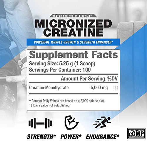 -. Feature : Micronized particle size for better absorption and quicker delivery. / Supports increased muscle cell size via muscle cell hydration. / Enhance endurance, recovery, and delay muscular fatigue. / Increase strength, power, and endurance. / 100 serving per container- 100 Day Supply!