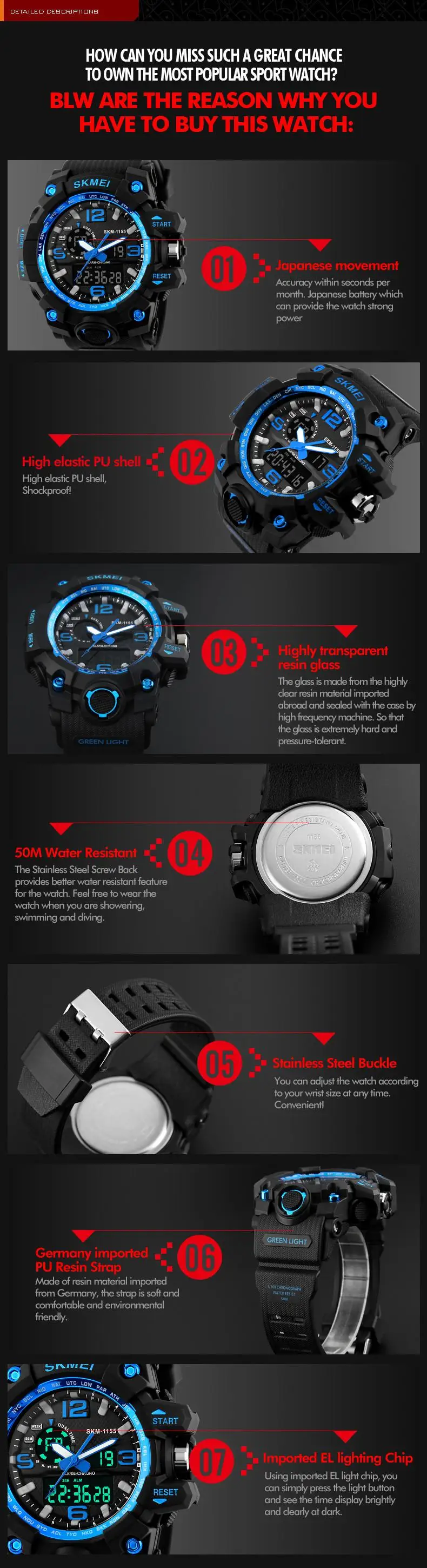 Feature:Stop Watch,Back Light,Shock Resistant,LED display,Auto Date,Chronograph,Complete Calendar,Water Resistant,Alarm
