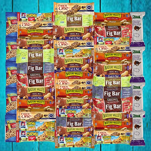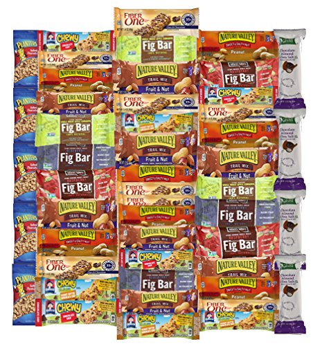 - Bundle Includes: 9 Natures Fig Bar - 2 oz, 8 Fiber One Bar - 1.4 oz, 4 Kashi Chocolate Almond & Sea Salt - 1.2 oz, 8 Quaker Chewy Bar - 0.84 oz, 8 Nature Valley Trail Mix - 1.2 oz, 8 Nature Valley Sweet & Salty - 1.2 oz, & 5 Planters Peanuts - 1 oz