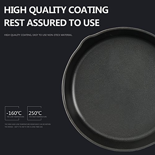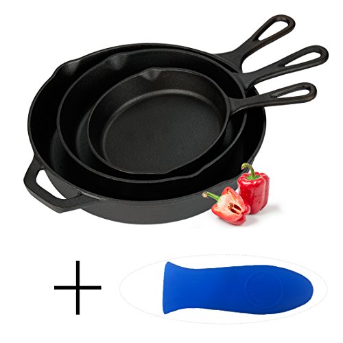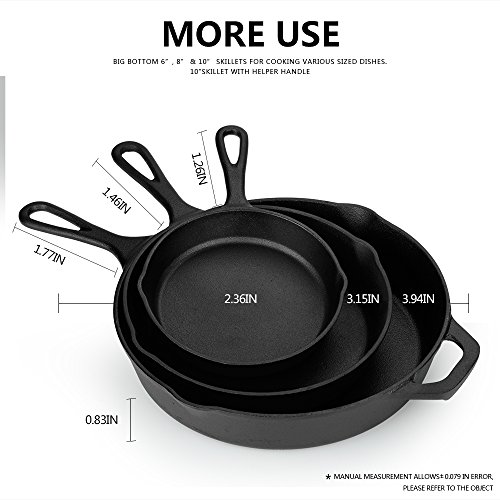 Studio : Kookantage Publisher : Kookantage Product Description Comes with a 10 inch, 8 inch and 6 inch saute frying pans skillets. Cast iron materials provide better heat retention for more even cooking. Factory Pre-seasoning more durable than home seasoning. The preseasoned skillets enhance the flavors of the food you're cooking, whether it's peach cobbler or bacon.