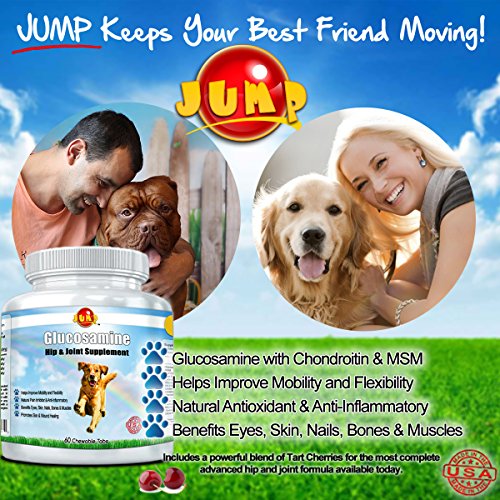 - JUMP Advanced Strength Dog glucosamine and chondroitin Hip & Joint support with Tart Cherry works to promote strong connective tissues, aid in calcium absorption and bone density. Helps protect against conditions associated with inflammation-including cancer, cardiovascular disease, Alzheimer's disease. Best dog joint supplement compared to any others. We are dog owners just like you! We care about our dogs and believe our dog arthritis supplement will benefit your family!