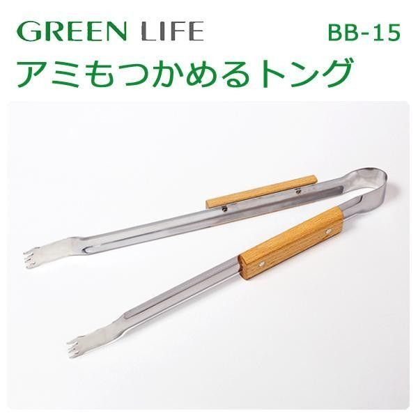網を簡単に持ち上げることができます。炭足しがカンタン・便利!先端部が新形状になり食材をつかみやすい。熱くなりにくい天然木のハンドルです。 製造国:台湾 素材・材質:本体:ステンレスハンドル部:天然木(ブナ) 商品サイズ:約L360×H30mm 重量:200g ※サプライヤー直送品 ご注文後2~3営業日後の出荷となります【商品名】グリーンライフ アミもつかめるトング BB-15