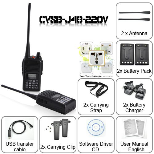 -. Feature : Powerful pair of walkie talkie handsets. VOX function for true hands-free communication. Uses open UHF radio frequencies. Easy to use and highly reliable. Durable construction can withstand mild impacts. / NOTE: This product works with 220V only. For the 110V version of this product please see SKU CV-AG-CVSB-J48-110V. Product Description: Walkie Talkie Set. Output Power: 5W. Frequency Range (UHF): 400 - 469.995 MHz. Communication Range: 3-5KM+. / Charging Station Power Supply: 220V. Talk Time: About 2 hours for non-stop use. Charging Time: 5 Hours. Dimensions (with antenna on): L:245 x W:60 x D:33 (mm). / Especially good for volunteer fire and ambulance departments with a limited budget (work as good as products from Motorola or Siemens but cost 1/5th the price). These transmitting and receiving two-way radio walkie talkies also go by the name "Professional Walkie Talkie Set, UHF Transceiver" in the press. / Package Contents: (2) Walkie Talkie. (2) Rechargeable Battery Pack. (2) Charging Base (220V). (2) Antenna. (2) Wrist strap. (2) Carrying clip. Manual - English. USB transfer cable. CD with drivers.