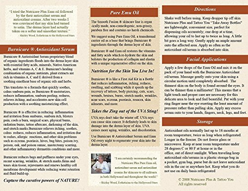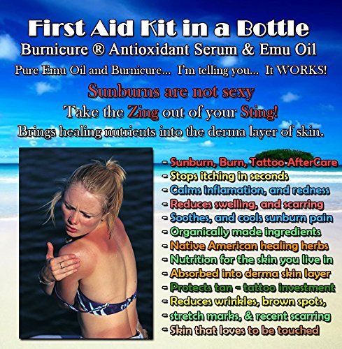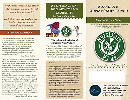 -. Feature : Re-hydrates the skin and the production of collagen and elastin with a unique regenerative effect. / Firms and tones skin tissue, rejuvenates and renews healthy cell membrane development while reducing water retention and fluid build-up. / Burnicure ® Antioxidant Serum has a proP.R.Ietary blend that is rich in vitamin A, C and E. A unique healing combination that is derived from organic oils, organic nutrients, and organic plant extracts from Native American herbs. / Product Brochures can be downloaded at our website that is listed on each product.