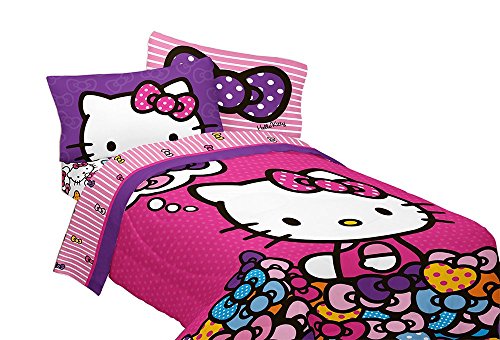 This Sanrio Hello Kitty what's not to love 72"x86" twin/full comforter reverses from a large image of Hello Kitty on a pink ground to small images of Hello Kitty with bows on the reverse, also a pink ground. Made of 100% polyester.