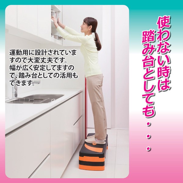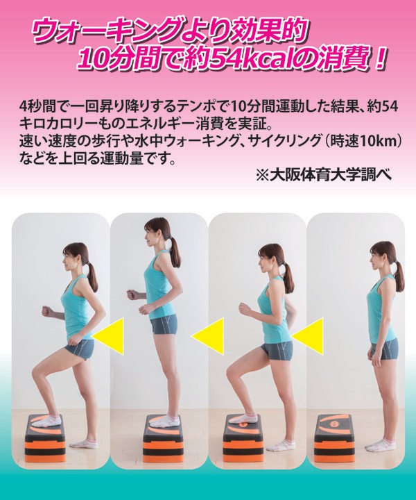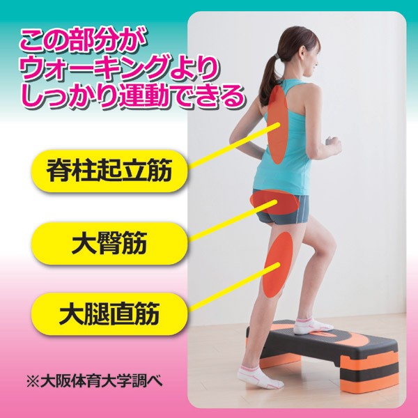 本製品は、室内で誰にも見られずにその「上り下り秘密運動」ができます。スローなテンポで、筋肉に意識を集中させながら昇降運動を繰り返すことをオススメします。毎日少しずつで結構ですが、続けて運動することで変化が期待できるでしょう。高さは3段階に調節できますので、身長や運動量に合わせて調節してください。約10分間の昇降運動で、54キロカロリーもエネルギーを消費することができます(大阪体育大学調べ)。通常のウォーキングに比べ、脊柱起立筋(背中部分)、大臀筋(お尻)、大腿直筋(太もも部分の大きな筋肉)が良く動く運動であることがわかりました(大阪体育大学調べ)。踏み台部分は広く安定感があるので、運動しない時など、ちょっとした踏み台として利用もできます。