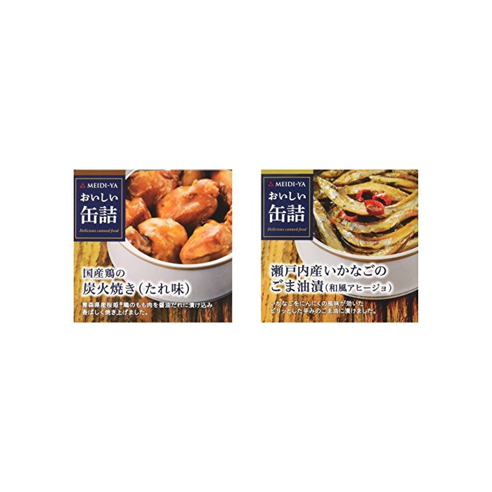 원본상품명: 明治屋 おいしい缶詰 ?産?の炭火?き(たれ味) 70g/???産いかなごのごま油漬(和風アヒ?ジョ) 75g