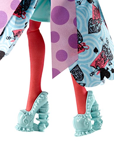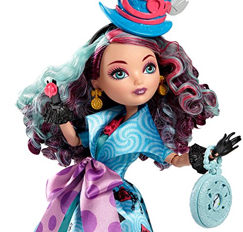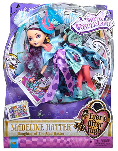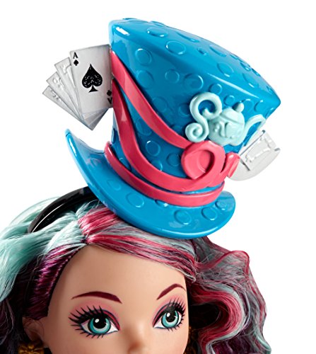 -. Feature : In "Way Too Wonderland," Raven Queen tries to magically reverse her mother's curse on Wonderland and accidentally transports herself and her friends to Wonderland High! / As Kitty Cheshire, Madeline Hatter, Apple White and Lizzie Hearts fall down the rabbit hole, their outfits transform into spellbinding dresses with wonderlandful charm -- bold neons, beautiful pastels and playing card inspiration / Madeline Hatter doll, daughter of the Mad Hatter from Alice's Adventures in Wonderland, is tea-riffic wearing a dress and coat in her signature colors with bold neon, beautiful pastels, a playing card-inspired print and a polka-dot oversized bow / Colorful hairstreaks and an exaggerated top hat with playing card and teapot decorations are "just right" for Wonderland / Hexquisite detail, spelltacular shoes, black wrist cuffs, colorful tights and a timely blue pocket watch (that opens!) complete her charming look