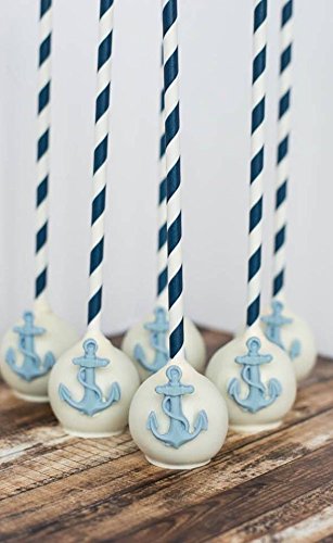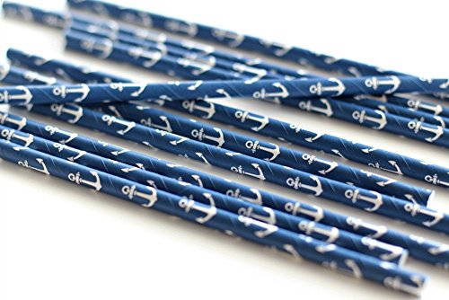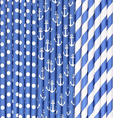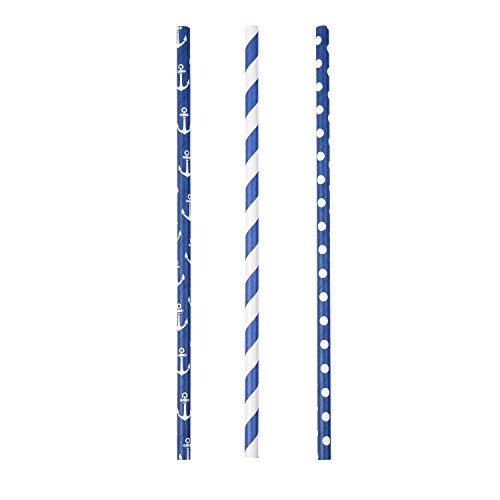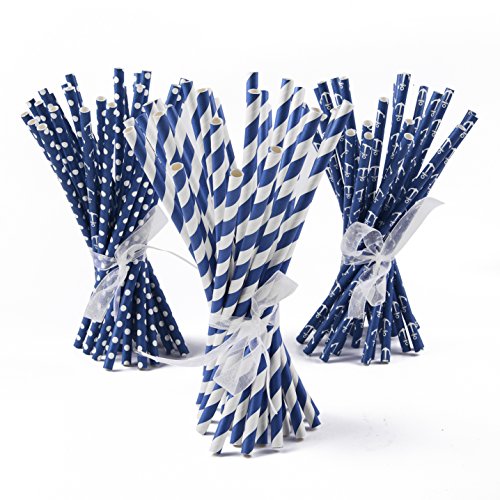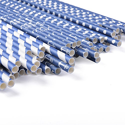 Navy Nautical Paper Straws - 75 pack of 100% Biodegradable Paper Straws for Baby or Bridal Showers Decor, Birthdays, Weddings, & Bachelorettes Parties - Summer Theme Backyard Party Decoration Ideas