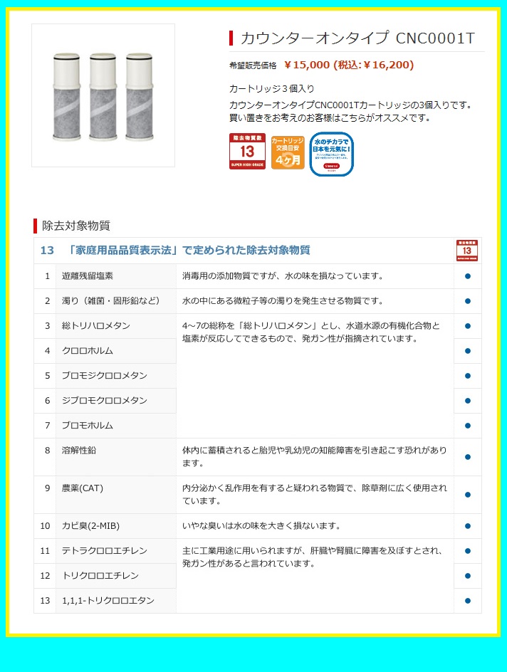 ●除去できる成分:遊離残留塩素/雑菌・固形鉛/総トリハロメタン/溶解性鉛/農薬(CAT)