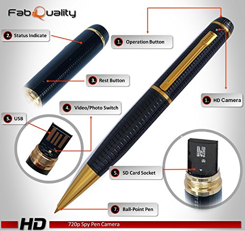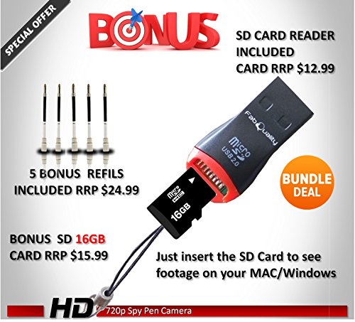 -. Feature : PROFESSIONAL STEALTH HIDDEN CAMERA EXECUTIVE PEN - PLUG & PLAY into any PC/Mac. Simply record your footage, plug the spy pen into your computer with the included USB cable, and review your footage. That's all it takes! User friendly and a complete no brainer to use. Our spy pen camera is made adhering to the highest manufacturing standards. This superior pen offers the highest resolution of Multifunction 1920*1080p video frame rate 30 FPS QUALITY That's better than ANY SPY CAMERA ON THE MARKET! / 1080P TRUE HD Recorder in 1920*1080p HD video resolution & 8 mega pixels, Meticulously engineered to perfection for crystal clear video recording. Just one click on and one click off allows you to start/stop recording video right away. Inbuilt rechargeable Polymer Lithium battery (220mAH) offers class leading recording time. Non-Stop VIDEO Recording mode, or use MOTION DETECTION VIDEO RECORDING MODE allows you to record what matters ensuring you don't miss a thing, while maximising battery life / NO SOFTWARE TO LOAD - This is the best plug and play pen on the market! user-friendly that a child could operate it, this Pen Camera is both PC and Mac Compatible 2.0 USB (with included USB cord). Date stamps can be added as reference points on any recordings or images, so organizing your data is breeze. There is no need to install a driver into the PC. Convenient, compact and fun, it does not get much better than the Amazing Pen Camera. (video Surveillance Cameras, Surveillance DVR, ) / BONUS BUNDLE INCLUDED 5X Ink fills RRP $24 & Free 16GB SD Card RRP $14.99 + USB Reader - Easy plug and play operation with its own full size built-in USB connector or you can use the USB cable to charge the pen camera through the computer. This means you do not have to remember to carry around extra parts. Plug it into the USB port of your smart TV for instant picture and video viewing. Do it at your next family gathering and see the amazed look on everyone's face when they see themselves on TV. / WE OFFER THE BEST WARRANTY ON AMAZON! LIMITED TIME OFFER - Special Offer For Limited Time Saving You Money! Dont Miss Out Buy now and enjoy a 12 MONTH WARRANTY with our 90 day "No questions asked" money back guarantee! Don't trust one of those cheap, knock-off spy pens when the highest quality spy pen is right at your fingertips. Dont Miss The Spy Pen,Free 16GB Micro Card Included For HD Video and Image Recording