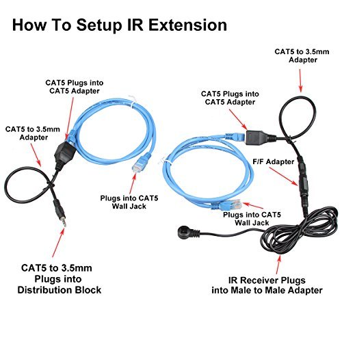Package list: 2x 3.5mm Male TO RJ45 Adapters 2x 3Ft(1M) CAT5 Cables 1*3.5mm Female to Female Adapter 1*3.5mm 38Khz IR Receiver Cable 5FT (1.5M)