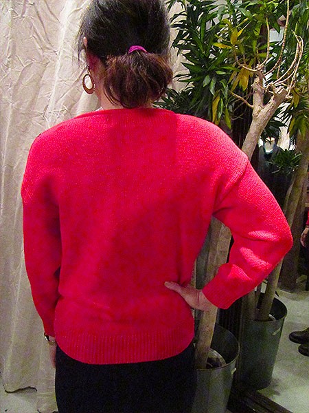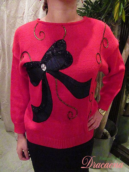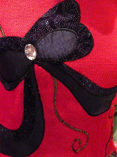 ラミー(ウール)とコットン素材なので春先や秋口から着られるセーターです。大胆なリボンデザインがインパクト大です!黒リボンはベロア地、ラメが細かく散りばめられ大きなビジュー付き。コーデの主役になる一枚です。