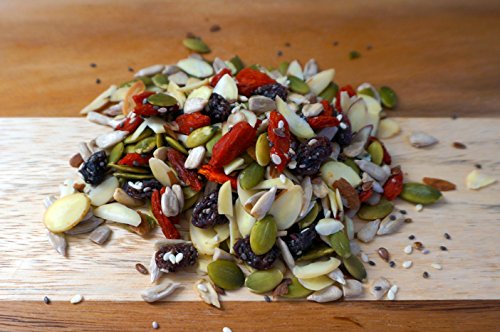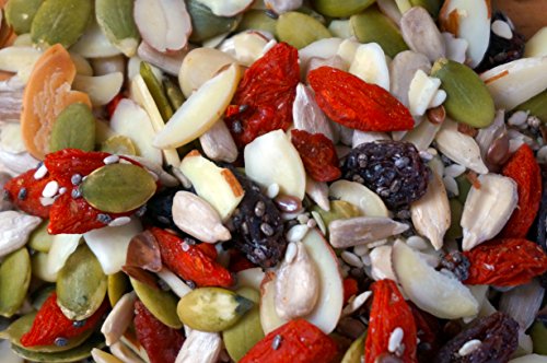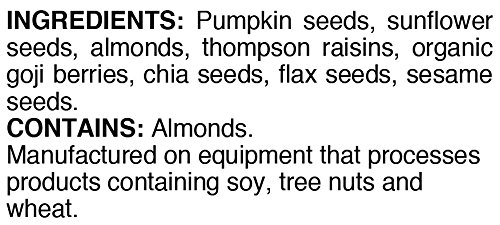 -. Feature : A delicious and healthy blend of organic goji berries, almonds, raisins, chia, flax, pumpkin, sesame and sunflower seeds / All natural ingredients, no preservatives and nothing added / Provides plenty of antioxidants, fiber, healthy fats, minerals and vitamins / Good source of fiber, iron and vitamin A / Comes in resealable barrier bag to protect ingredients from moisture and light